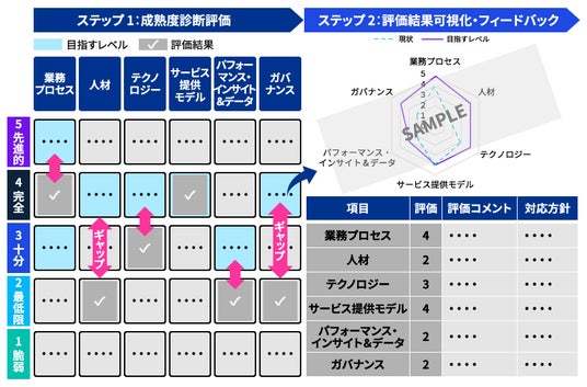 KPMGコンサルティングは、本サービスの提供を通じ「業務プロセス」「人材」「テクノロジー」「サービス提供モデル」「パフォーマンス・インサイト&データ」「ガバナンス」の6つの観点から独自の評価を行い、リスクマネジメントの現状把握、課題と取組み優先度、および課題解決の方向性を明らかにします。さらには、本診断モデルでは業界内の水準も考慮し、現状と目指すレベルのギャップを明確化することで、リスクマネジメント体制の高度化に向けた支援を行います。