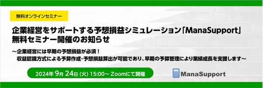 株式会社ニーズウェル(本社:東京都千代田区、代表取締役社長 船津浩三)は、2024年9月24日(火)15時より、無料オンラインセミナー「企業経営をサポートする予想損益シミュレーション「ManaSupport」無料セミナー ~企業経営には早期の予想損益が必須!収益認識方式による予算作成・予想損益算出が可能であり、早期の予算管理により業績成長を支援します~」を開催します。