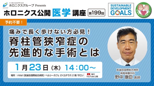 医療法人医誠会(大阪府大阪市 代表者:谷 幸治)では、第199回ホロニクス公開医学講座 『痛みで長く歩けない方必見!脊柱管狭窄症の先進的な手術とは』を大阪市北区南扇町にあるi-Mall内ヘルシーカフェ「さくらテラス 2階サロン」にて2025年1月23日(木)に開催いたします。
