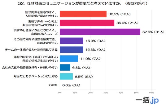 - 最も多かったのは「誤解や行き違いが起こりにくく、意思疎通がスムーズ」で、全体の52.5%(31人)を占めました。これは、対面コミュニケーションの最大の価値が、正確かつ迅速な情報伝達にあると多くの人が感じていることを示しています。