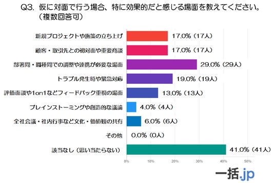 - 最も多かったのは「該当なし(思い当たらない)」で、全体の41.0%(41人)を占めました。回答者の多くが特定の場面において対面が特に効果的だと強く感じていないことを示しており、業務の多くがオンラインや非対面で十分対応可能だと考えている層が一定数存在することをうかがわせます。