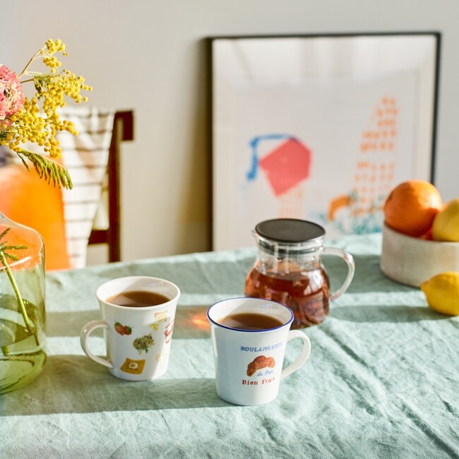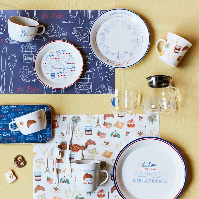 S,M,Lの3サイズ展開のプレートや、スープマグとしても使いやすい大きめのマグなどがラインアップ。エッフェル塔やクロワッサンのアート、トリコロールカラーの縁どりが朝の食卓にフランスの空気を運びます。