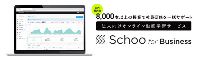 法人向けオンライン研修サービス「Schoo for Business」は「今学びたい学習コンテンツに出会える」をコアバリューとし、社会人向け学習動画を約8,000本提供。ビジネスマナーやスキル、営業・プログラミング・デザインの実務スキルについてオンライン動画にて持続的な学習環境を提供することで導入企業は累計3,200社を突破。学習動画を元にした研修カリキュラムの提供やレポート提出、利用者の学習時間・学習傾向から興味のある分野を分析可能。オンライン集合学習機能も搭載。自発型学習による社員一人ひとりの潜在した可能性との出逢い、成長の機会の提供に役立てられている。