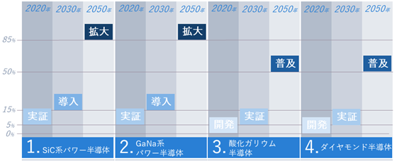 材料としては、主にシリコンが用いられていますが、SiC系、GaNa系、酸化ガリウム、ダイヤモンドなど、高い電圧に耐え、ロスを減らすための半導体材料の研究開発が進んでいます。