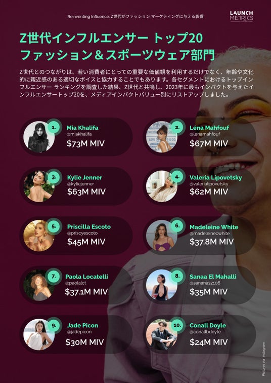 レポートでは、LOEWEから、SKIMやNikeまで、ラグジュアリー、プレミアム、マスマーケットの各セグメント別上位20のファッションおよびスポーツウェアブランドを調査し、これらのブランドがどのようにして消費者の意識に浸透しているかを明らかにしています。また、最も影響力のあったZ世代のインフルエンサーや、ブランドの可視性とエンゲージメントを促進するグローバルなセレブリティについても取り上げています。