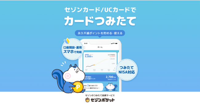 セゾンカード・UCカードを使って月々1,000円からカードで気軽に投資信託や株のつみたてができる証券サービスとして、当社と株式会社クレディセゾン(以下「クレディセゾン」)が協業し、2019年にサービス提供を開始しました。「知識がないから、始められない」というユーザーの悩みに寄り添い、徹底的にわかりやすさを追求して開発されていることが最大の特徴です。また、セゾンカードやUCカードのユーザー様がより快適にライフスタイルに投資を組み込めるよう、セゾンカード・UCカードの各種WEBサービス※のIDとパスワードを使ってログインすることで自動的にカード情報が連携され、シームレスに口座開設が可能。口座開設から実際の運用まで、スマホ1台で完結します。運用において、永久不滅ポイントを使ったり貯めたりすることもできます。
