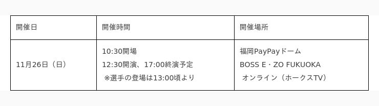 福岡ソフトバンクホークス株式会社(本社:福岡県福岡市 代表取締役社長CEO:後藤芳光)は、11月26日(日)にファンフェスティバル「鷹奉祭(たかほーさい)」を開催しますので、お知らせします。