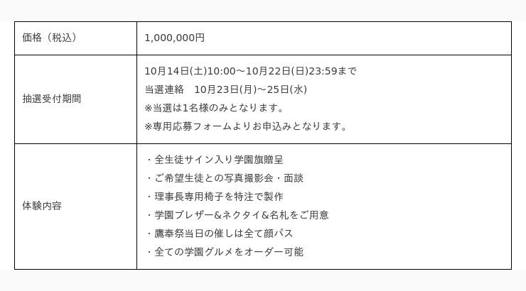 私立よかよか学園の1日理事長に1名様のみご就任いただけます。当日はステージ前に理事長専用豪華お座席をご準備し、ナイスなビューで生徒たちのステージをご堪能いただけるほか、当日の催しは全て顔パスにて視察・ご体験いただけます。専用コンシェルジュが事前にご要望をお伺いし、当日のご視察プランを作成いたします。