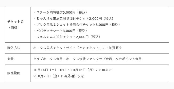 今年も学園祭をテーマとし、「私立よかよか学園」の生徒一同が一年間応援していただいた皆さまへの感謝の気持ちを込めておもてなしをします。学園体験入学や生徒有志が運営するカフェでティーパーティーなどの交流イベントや、生徒によるグルメのふるまいなど学園生活に没入できる企画を多数ご用意しました。また、当日のイベントが全て顔パスになる「私立よかよか学園理事長」を1名、税込100万円で募集します。理事長となる方には、専用コンシェルジュ付きで時間の許す限り生徒との交流や学園グルメをお楽しみいただきながら「鷹奉祭」を視察いただきます。理事長プランはホークス公式サイトにて、各種チケットはホークス公式チケットサイト「タカチケット」にて10月14日(土)10:00より抽選販売を開始します。
