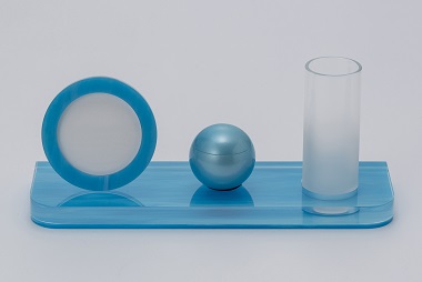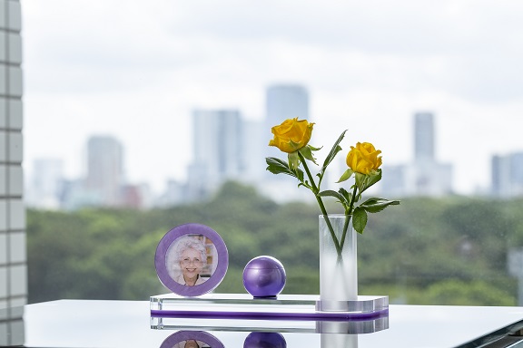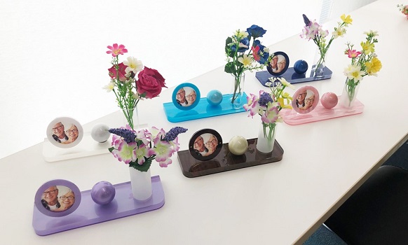 「Parfe」は、アクリル・金属(真鍮)・ガラスを組合せたオールインワンタイプです。プチポット(骨壺)と一緒に、花立やフォトフレームなどを別途揃えるお客様が多くいらっしゃる為、今回、省スペースで設置できるアクリル素材のステージに、同素材のミニ写真立、ガラス製の花立をすべてセットにした商品を開発、導入致しました。