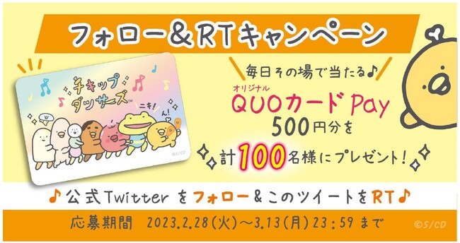 チキップダンサーズのイラストが入った「オリジナルQUOカードPay 500円分」が計100名様に当たります。