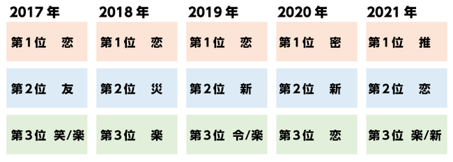 「恋」は調査を開始した2017年から3年連続1位、2020年以降も毎年3位以内にランクインしています。今後の結果にも注目です。