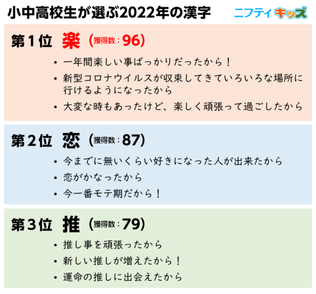 『小中高校生が選ぶ2022年の漢字』は、「ニフティキッズ」にて、2022年を表す漢字と、その漢字を選んだ理由についてアンケートを実施し、集まった回答結果をまとめたものです。