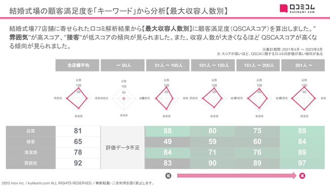 全体的に”雰囲気”が高スコア、”接客”が低スコアの傾向が見られました。また、収容人数が大きくなるほど QSCAスコアが高くなる傾向が見られました。