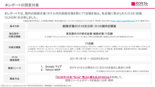 本レポートでは、都内の結婚式場(ホテル内の結婚式場を除く)77店舗を抽出、各店舗に寄せられた口コミ(総数13,243件)を分析しました。