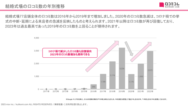 結婚式場77店舗全体の口コミ数は2016年から2019年まで増加しました。2020年の口コミ数急減は、コロナ禍での挙式の中断・延期による来店者の急減を反映したものと考えられます。2021年以降は口コミ数が再び回復しており、2023年は過去最高であった2019年の口コミ数を上回ることが期待されます。