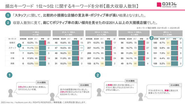 1.「スタッフ」に関して、比較的小規模な店舗の言及率・ポジティブ率が高い結果となりました。