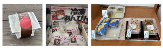 左:果汁溢れるフルーツ大福 中央:お客様の声から生まれたあんびん 右:人気の定番商品、山菜おこわも絶品