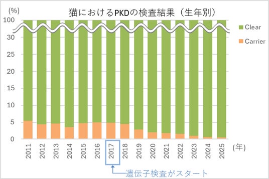 PKDは、腎臓に多数の嚢胞(液体の入った袋状の構造)が形成され、時間とともに大型化することで腎臓が圧迫され、腎機能が低下し腎不全を起こす病気です。明らかな症状が現れる時期は個体によりばらつきが大きく、多くの場合は中高齢になってから顕著になります。PKDはキャリアでも発症リスクのある「優性遺伝(顕性遺伝)」の遺伝形式をとります。また、アフェクテッドの場合は胎児の時点で死亡してしまうため、生体の遺伝病検査にてアフェクテッドが検出されることはないとされています。アニコムの検査においても、アフェクテッドは検出されず、検査を開始した2017年より後に生まれた猫ではキャリアの割合に明らかな減少がみられました。