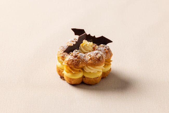 シーズン毎の限定フレーバーが人気のパリブレストも、ハロウィンバージョンでご用意。シュー生地に濃厚なカスタードクリームを絞り、さらにその上から、かぼちゃとホワイトチョコレートを混ぜたクリーム、ミルクジャム入りのパンプキンクリームを交互に絞ります。軽い口当たりのシュー生地でサンドし、仕上げにチョコレートのコウモリをトッピングすれば完成です。旬のかぼちゃの魅力が詰まった一品を存分にお楽しみください。