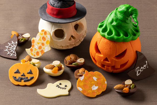 ナッツを乗せた3種のマンディアンチョコレートやハロウィンモチーフのチョコレートを、ちょっぴり怖いジャック オ ランタンやスカルの中に忍ばせました。チョコレートでつくるジャック オ ランタンやスカルももちろんお召し上がりいただける、ハロウィンらしい遊び心あふれるスイーツです。