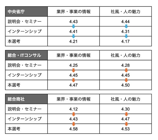 その結果、総合・ITコンサルと総合商社がインターンシップ、本選考と進むにつれて評価が上昇しているのに対し、中央省庁は下降していることが明らかになりました。