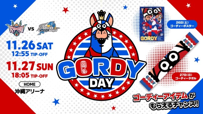 11月26日(土)、27日(日)はゴーディーづくしの2日間「ゴーディー DAY」を開催!この2日間限定でキングスの選手はゴーディーカラーの4th ユニフォーム「ゴーディーエディション」を着用して試合に臨みます。さらに、両日共にオリジナルのゴーディーアイテムが先着6,000名にプレゼント!ぜひ沖縄アリーナにてキングスへの応援をよろしくお願いします。