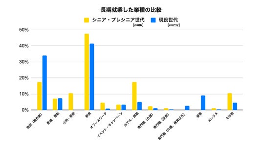 長期就業した業種をシニア・プレシニア世代、現役世代間で比較すると、以下のグラフの通りになりました。接客が必要で人と接する機会の多い飲食業においても、シニア・プレシニア世代が長期就業スタッフとして活躍していることが分かります。