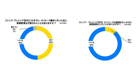 シニア・プレシニア世代の働き手の49%が、勤務先から長期就業を打診されたことがあると回答。さらに11%の働き手が、実際に長期就業をしたことがあると回答しました。