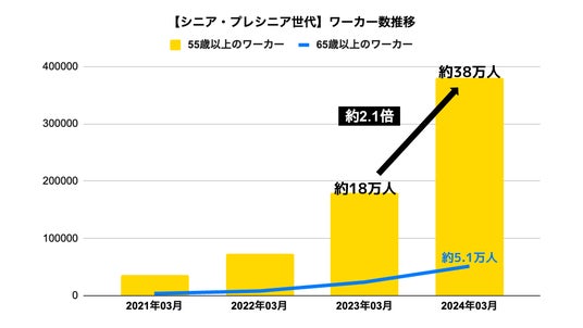 タイミーに登録している55歳以上のシニア・プレシニア世代の働き手は、2024年3月時点で約38万人、65歳以上のシニア世代に絞ると約5.1万人となっています。シニア・プレシニア世代のワーカーは前年同月比で約2.1倍と、拡大していることがわかりました。