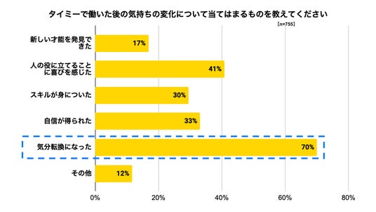 - タイミーで働いた後の気持ちの変化としては、「気分転換になった」が70%、「人の役に立てることに喜びを感じた」が41%、「自信が得られた」が33%。シニア・プレシニア世代においてはスキマ時間で「はたらく」を通じて社会との接点を得られたことに対する満足感が高いことが窺える。