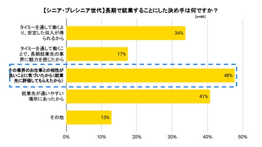 一方で、「これまで働いたことのない業種を経験してみたいと思ったから(38%)」といった経験価値に重きをおいたものや、「適度に体を動かすことによる健康維持のため(33%)」といったシニア・プレシニア世代らしい理由も票を集めました。