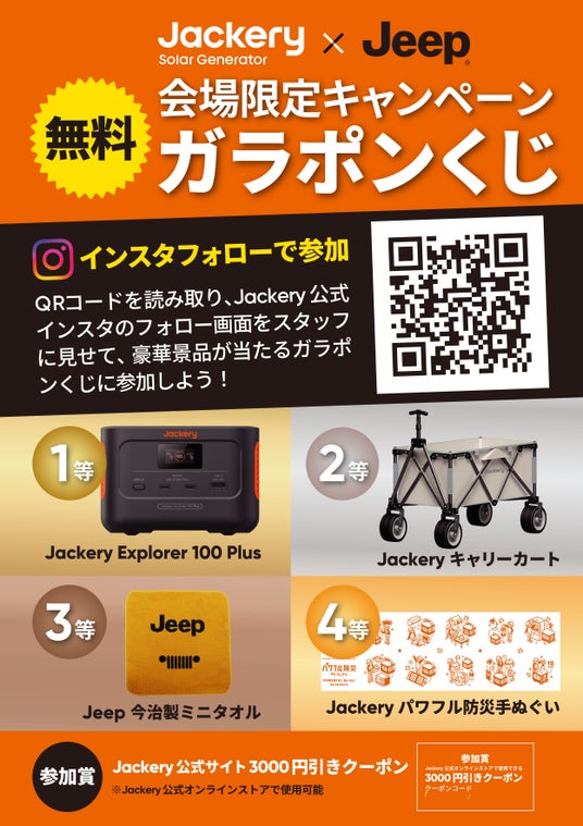Jackeryブース(No.553)では、日常や非常時に役立つポータブル電源やソーラーパネルの製品を展示します。また、自動車ブランドのJeepとのコラボ企画『その日常に電気が走る』を実施し、会場限定の豪華景品が当たるガラポンくじもご用意しています。