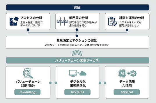 こうした状況ではバリューチェーン全体を俯瞰したデータが把握できず、迅速な意思決定や全社的な需要予測といった全体最適が進みません。