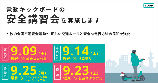 電動キックボードや電動アシスト自転車などの「電動マイクロモビリティ」を取り扱うシェアリングサービス「LUUP(ループ)」を展開する株式会社Luup(本社:東京都千代田区、代表取締役社長兼CEO:岡井大輝、以下「Luup」)は、「秋の全国交通安全運動」に合わせ、各展開エリアの警察と連携し、電動キックボードの安全講習会を連続的に開催します。講習会では、電動キックボードの正しい交通ルールのレクチャーや安全な走行方法をお伝えし、実際に所定エリア内でご試乗いただきます。