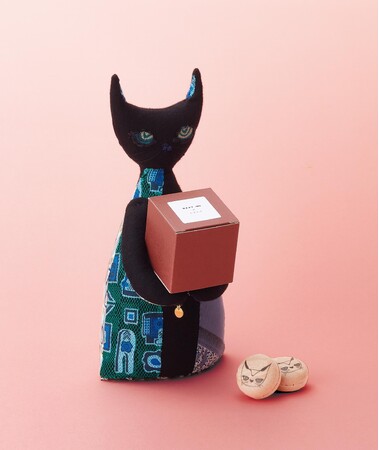 辻口シェフがアムール期間中に着用していた「ねこ耳帽子」から着想を得て猫モチーフでデザイン。モナマカロンショコラにもコラボレーションした猫をプリント。