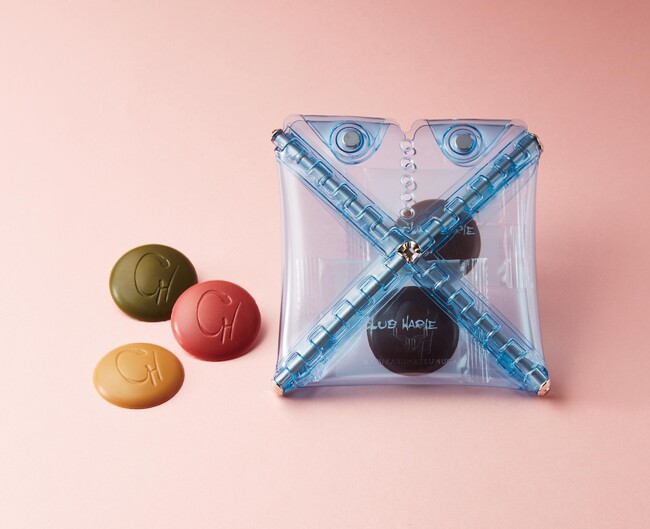 PVC素材を使用したマルチに使えるケースは、コインサイズのチョコレートが収まる便利なサイズ感。先行販売で、6色バリエーションで展開。