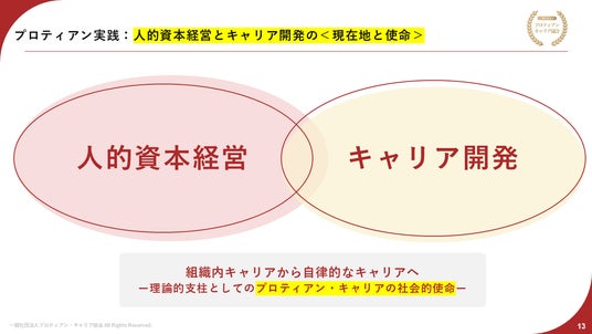 本講演では、代表理事の田中 研之輔が登壇し、現代版プロティアン・キャリア理論の戦略的思考と実践、マネジメントの変遷、テクノロジーを活用したキャリア開発の分析・活用などの最新知見を共有しました。