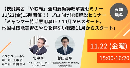 2024年11月22日(金)15時に【技能実習「やむ転」運用要領詳細解説セミナー】「ミャンマー特活悪用禁止!10月からスタート。他国は技能実習のやむを得ない転籍11月からスタート」