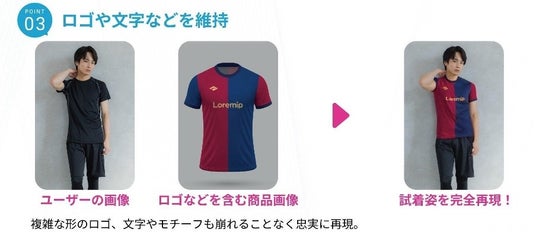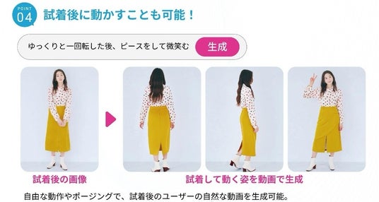 - 「質感」の再現力:衣服の素材感やシルエット、着用時のバランスを細部まで高精度に再現し、実際に着るとこう見えるというイメージを自然に想起できる試着体験を実現。