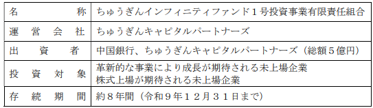 当行ならびにちゅうぎんキャピタルパートナーズ(岡山市北区丸の内一丁目15番20号ちゅうぎん本店ビル9階 代表取締役 小橋 栄紀)は、スタートアップ企業を出資対象とする『ちゅうぎんインフィニティファンド』が、株式会社シェアリングエネルギー(東京都港区 代表取締役 上村 一行)の第三者割当増資を引受けましたことを、お知らせいたします。