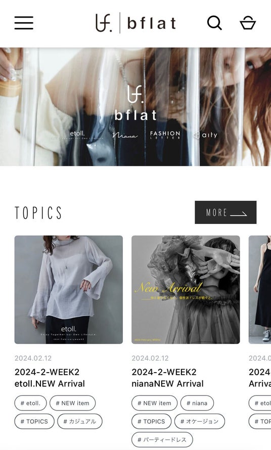株式会社BFLAT が運営する「bflat」は、カジュアルからオケージョナルまで幅広い 4 つのブランドを取り扱うレディースファッション通販です。カートシステムは Shopify のコマースプラットフォーム「Shopify Plus」を採用しています。