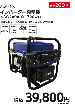 商品名: AQCCESS インバーター発電機 AQ2000iX(1700w)