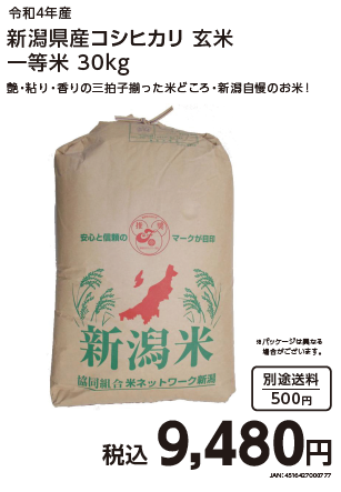 商品名: 令和4年産 新潟県産コシヒカリ 玄米 一等米 30kg