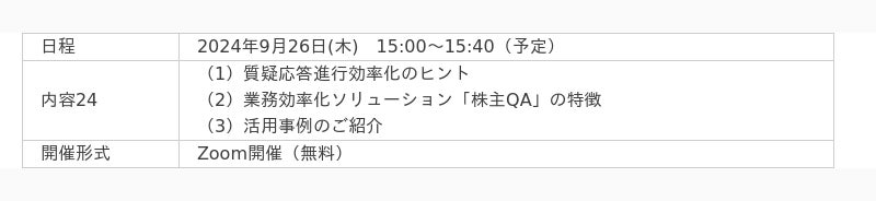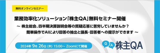 株式会社ニーズウェル(本社:東京都千代田区、代表取締役社長 船津浩三)は、2024年9月26日(木)15時より、無料オンラインセミナー「業務効率化ソリューション「株主QA」無料セミナー ~株主総会、四半期決算説明会等の質疑応答に苦労していませんか?簡単操作でAIにより回答の抽出と議長・回答者への提示ができます~」を開催します。