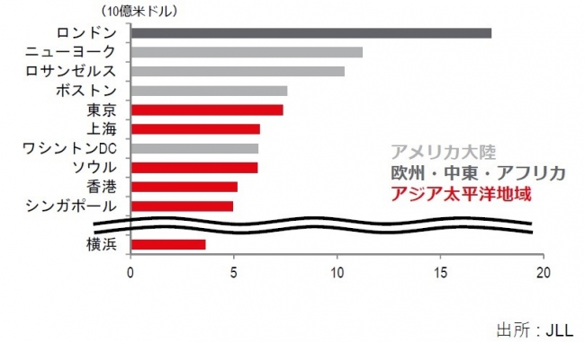 世界都市別に投資額をみると、ロンドンが3年ぶりに1位となり、東京の投資額は74億ドルで世界第5位となった。東京は2017年第1四半期では世界3位となっていたが、東京都心で投資機会が限定的な状況が続いていることから、上半期では順位を下げた。また、横浜が15位にランクインした。第1四半期のみなとみらいセンタービルや三菱重工横浜ビルに引き続き、第2四半期でもTOCみなとみらいやコンカード横浜といった大型取引が続いた(図表2)