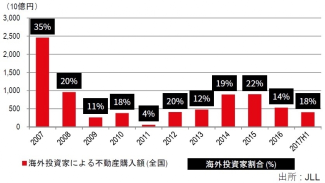 日本の商業用不動産投資額は、2015年、2016年と2年連続で減少したものの、2017年上半期は前年同期比で2ケタ成長となり、大型取引も散見されるなどポジティブな要因が増えている。したがって、JLLは2017年の日本の商業用不動産投資額を前年比増加の3.7兆円~4.0兆円になるものと予測している。