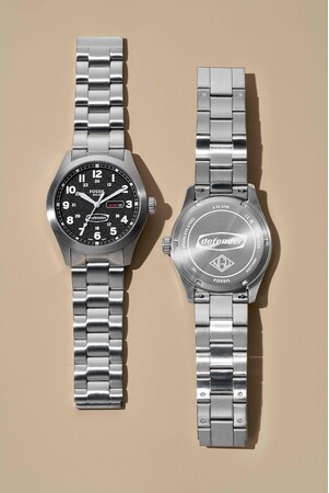 マットな仕上げのケースと実用的な文字盤には、大胆なアラビア数字と24時間ミリタリータイム、ハイコントラストなテクニカルダイヤル、ヴィンテージ感あふれるレイルロードトラッキングが採用され、夜光塗料を塗布した針の下には、オリジナルへのオマージュである「defender」ロゴがプリントされています。