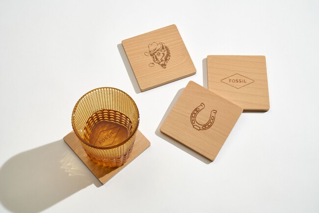 フォッシルのグラフィックやロゴを刻印した、FSC(R)認証リサイクルウッドコースター4枚セット、巾着ポーチ付き。 数量限定のため無くなり次第終了となります。