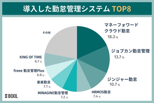 本調査において、導入した勤怠管理システムを選択式で尋ねたところ、最も回答が多かったのは「マネーフォワード クラウド勤怠」で18.3%でした。次いで「ジョブカン勤怠管理」が13.7%、そして「ジンジャー勤怠」が10.7%で続いています。